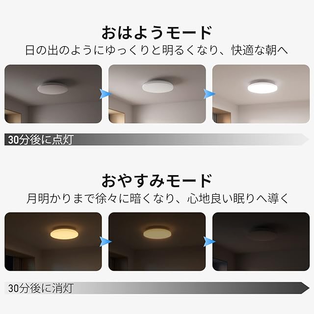 【明るさと色温度を無段階で調整可能】アプリで照明の調光調色を1%単位で調整可能。多様なプリセットモードも選択でき、ワンタッチでお好みの照明に切り替えられます。SwitchBotが開発した照明アルゴリズムによって、照明がゆっくり明るくなったり、ゆっくり暗くなったりします。