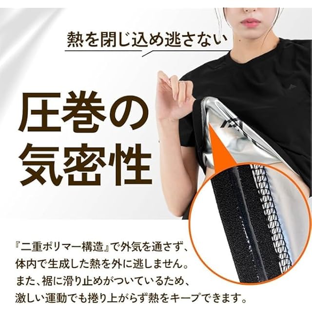 【驚きの発汗力】"ポリマー2重構造"を採用し、外気を通さず、体内で生成した熱を逃さない特殊設計。一般的なサウナスーツに比べて「高い気密性と保温力」が優れており、運動中の発汗を促すことで、身体に溜まった余計な水分や老廃物を排出し、基礎代謝を高める効果が期待できます。また、基礎代謝が上がるため、普段運動をしない方・日常生活でも汗をかきにくい方・冷え性の方にもオススメです。