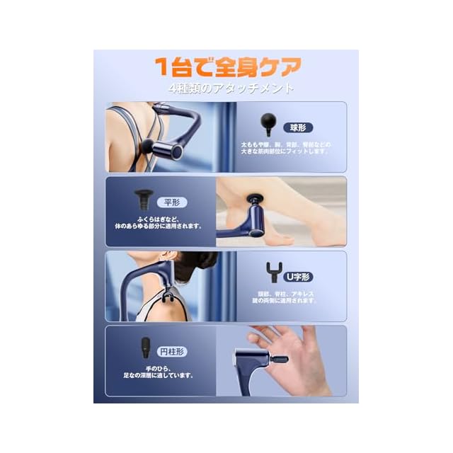 商品タイプ:驚きのパワー、1台で全身ケア、背中にも届く、超静音、急速充電