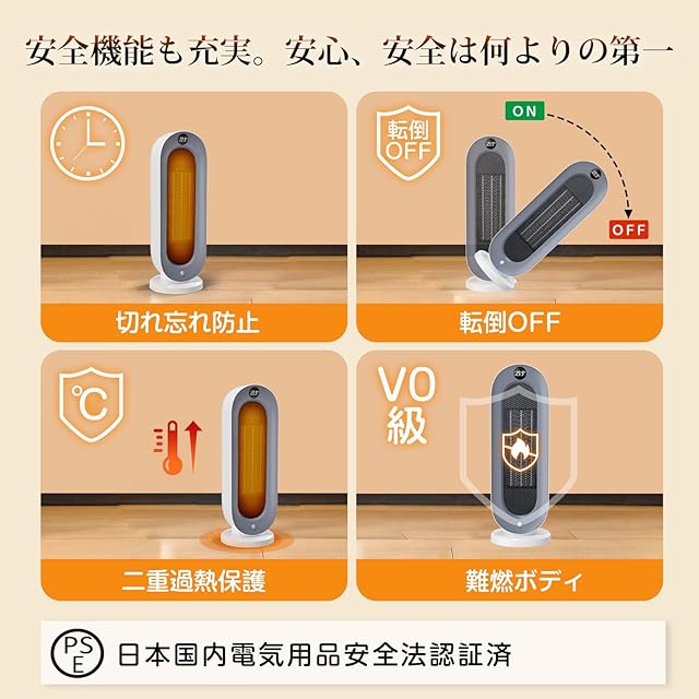 【転倒OFF・二重過熱保護・切り忘れ防止・V0級難燃ボディ】充実した安全機能、安心、安全は何よりの第一。①転倒OFF:地震などの不意な原因で転倒すると、電源が自動的に切る。②二重過熱保護:内部に温度センサーを搭載し、高温と低温二つの部分の温度を感知して、温度が上昇過ぎた時に、ヒーターが自動的に停止する。③切れ忘れ防止:運転開始から6時間後に自動的に停止します。外出の時、電源を消したかの不安は必要ない。④難燃性:セラミックヒーターのボディはV0級難燃素材を採用し、安全性さらに固める。