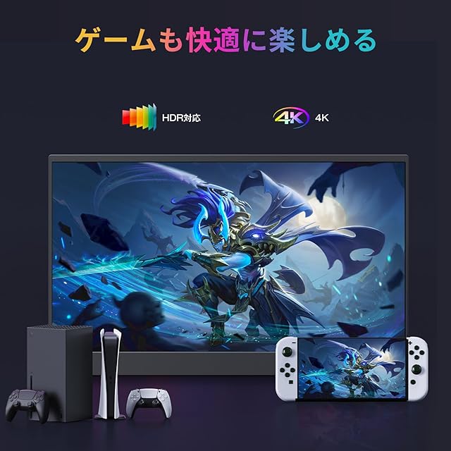 【遅延なくゲーム用としても優秀】この4KモバイルモニターはPS4、Xbox One、任天堂Switchなど多種なゲーム機に対応可能。遅延などが少なく、ドライバーを追加することなくすぐ使用でき、60Hzの高速応答も可能なので、FPSゲームやアクション映画など動きの速いコンテンツを楽しめます。FreeSyncに対応しているので、画像のテアリングを回避できて、画面がよりスムーズになり、ゲームをするのに最適。