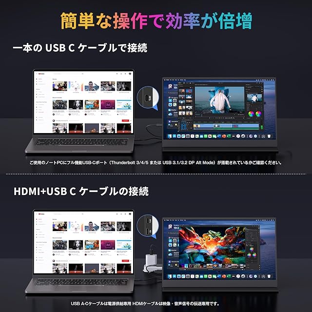 【ケーブル一本だけで接続可能】このモバイルディスプレイはMini HDMI、Type-C二つ、3.5mmイヤホン、豊富な入力端子をもって多様な接続方法を実現。何よりも便利なのは、Type-Cケーブル一本で映像出力と給電を同時に実現できます、しかも二つのType-C端子とも信号転送+給電両対応。Type C端子で接続できない端末は、HDMI接続との選択肢があります。両端子とも対応している端末なら自由に接続できます。ノードパソコン、デスクトップ、スマホ、ゲーム機などにも対応しています。ご注意:Type Cケーブル一本で接続する場合、接続の端末がDP ALT MODE(映像出力)に対応しなければなりません。接続端末から電源を取る場合、端末の電力低下で給電不足になることもあります。この場合、外部電源で給電してください。