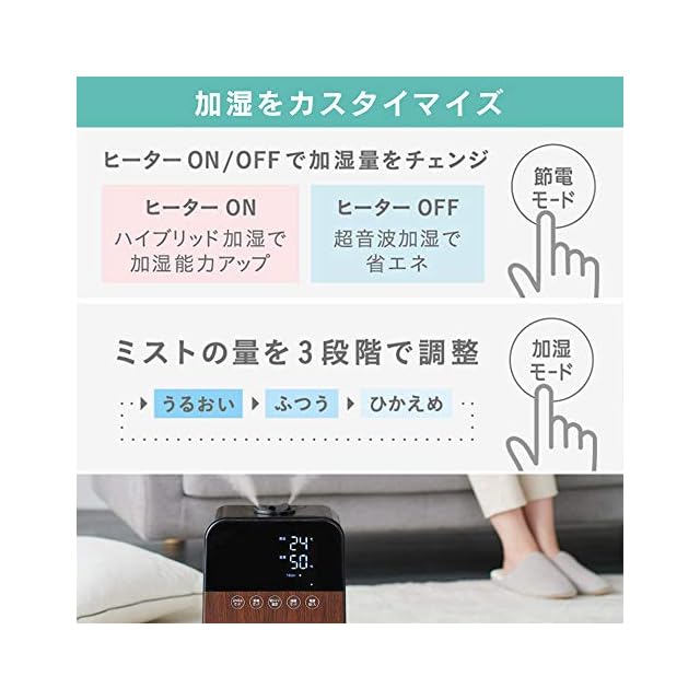 <節電モード>ヒーターON/ハイブリッド加湿で加湿能力UP!ヒーターOFF/超音波加湿で省エネに。