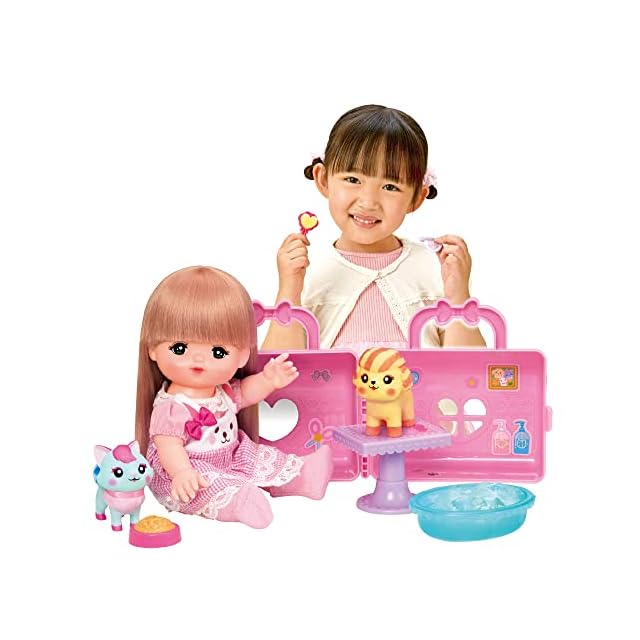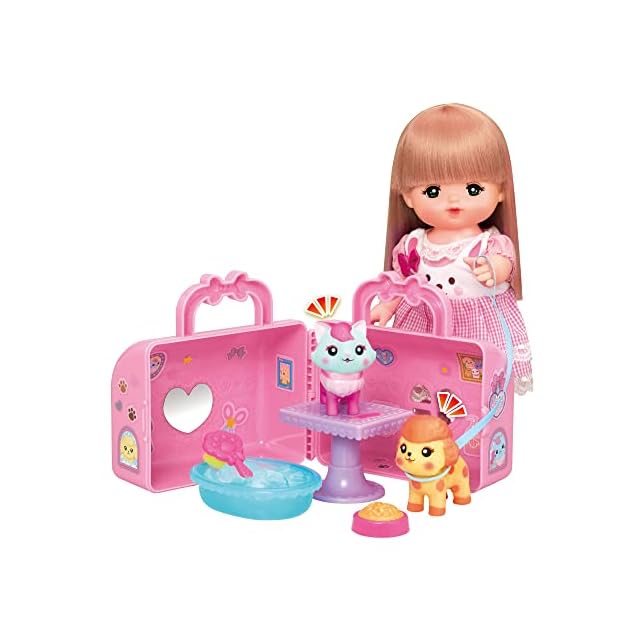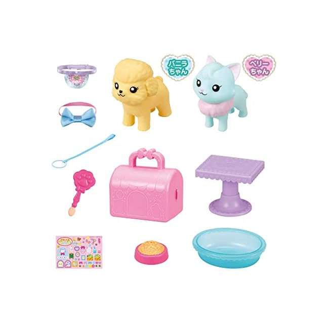 セット内容:ケース、バスタブ、トリミング台、ねこちゃん(ベリーちゃん)、わんちゃん(バニラちゃん)、メイクチップ、えさ、リボン、バンダナ、リード、シールセット