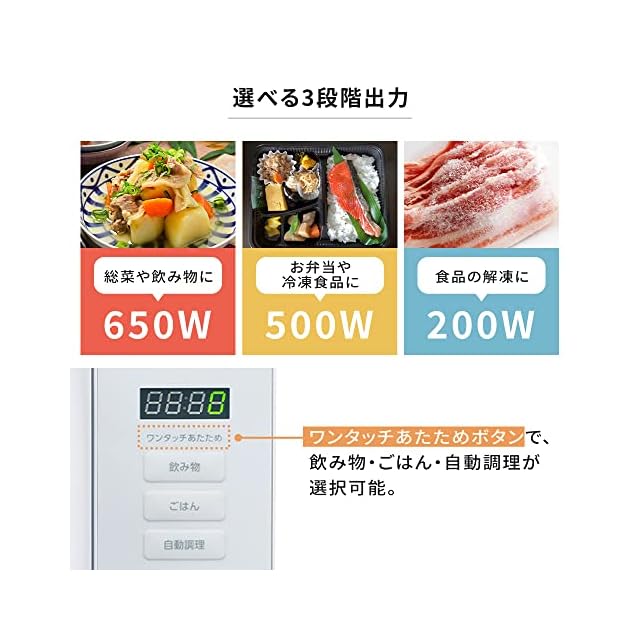 【電子レンジ ターンテーブル 17L】あたためも、解凍も簡単操作ができるシンプルデザインの電子レンジです。周波数50Hz(東日本)と60Hz(西日本)共用のヘルツフリータイプです。レンジ出力は50Hzと60Hzで、お住いの地域により異なります。[50Hz:2段階切り替え(500W/200W解凍)/60Hz:3段階切り替え(650W/500W/200W解凍)]。「飲み物/ごはん/自動調理」をタッチするだけで、美味しさを逃がさず加熱ができます。