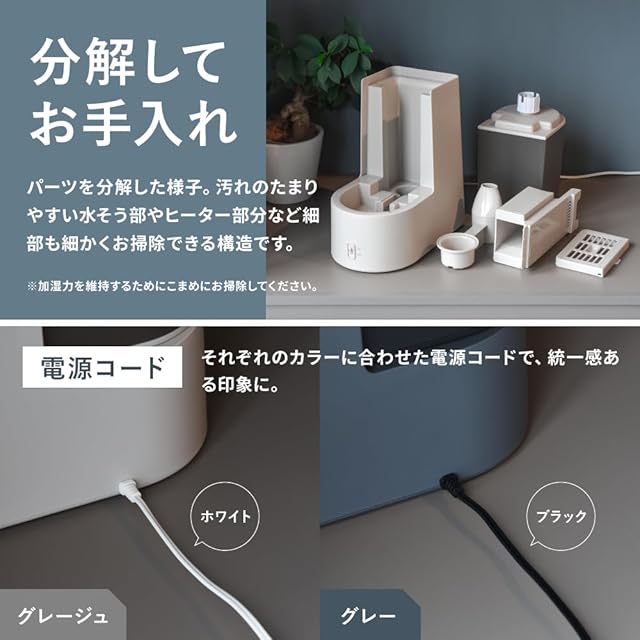 分解してお手入れ。パーツを分解した様子。汚れのたまりやすい水そう部やヒーター部分など細部も細かくお掃除できる構造です。 ※加湿力を維持するためにこまめにお掃除してください。