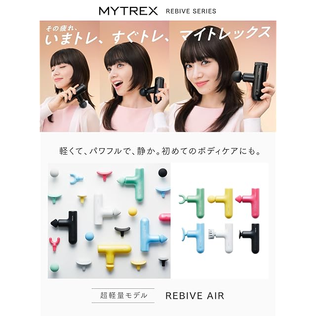 強く押し当てても止まらない。<br>シリーズ史上、最もカラフル。<br>ボディケアに遊び心を。<br>REBIVE SERIESから誕生。<br><br>[ Point! ]<br>コンパクトなのに優れた耐圧力。強く押し当てても止まらない。<br>最大約7Kg相当の圧力まで耐えられるートルク数130m-NM以上のパワフル設計ー<br><br>最大3,000回/分のハイパワー振動<br>振動レベルはお好みに応じて調整が可能です。<br><br>気になる表情筋にも。繊細振動で優しくケア<br>毎分900回転のフェイスモード搭載<br>フェイス専用のやさしいモードと丸形アタッチメントを使って、気になるお顔も安全にケアできます。<br><br>ココロ、踊り出す鮮やかなカラーバリエーション<br>生活にフィットする。忙しい日常に癒しのケアタイム<br><br>●商品名:MYTREX REBIVE AIR- マイトレックス リバイブ エア -<br>●品番:ブラック MT-RBA-22B<br>ホワイト MT-RBA-22W<br>グリーン MT-RBA-22G<br>ブルー MT-RBA-22BL<br>イエロー MT-RBA-22Y<br>ピンク MT-RBA-22PK<br>●発売元:株式会社創通メディカル<br>●製造組立:中国<br>●本体寸法:約133 × 76 × 35mm(アタッチメントを除く)<br>●重量:約250g<br>●パッケージ内容:・本体×1・充電用USBコード×1・アタッチメント×5・アタッチメント用ストッパーゴム(予備)×2・携帯用布袋×1・取扱説明書×1<br>