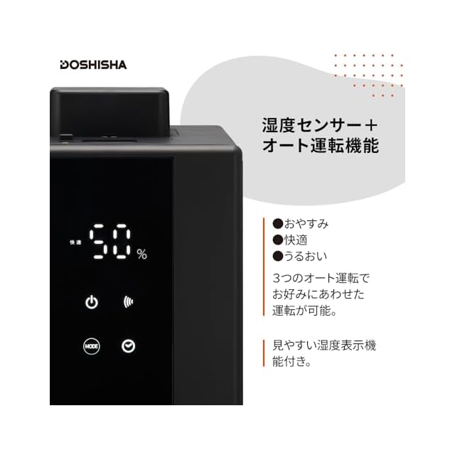 湿度センサー+オート運転機能。3つのオート運転でお好みにあわせた運転が可能(おやすみ・快適・うるおい)。見やすい湿度表示機能付き。