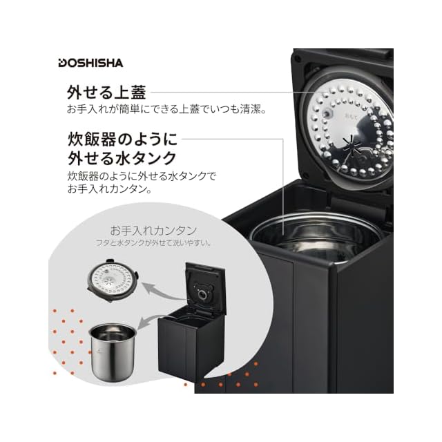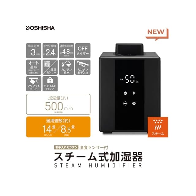 ドウシシャ 加湿器 スチーム式 湿度センサー付 お手入れカンタン 加湿量 500ml タンク容量 2.4L 4.8時間連続加湿 適用畳数 14畳(プレハブ)/8畳(木造) ブラック KSZ-501BK