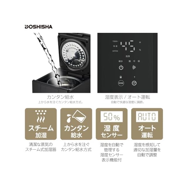 カンタン給水。上から水を注ぐカンタン給水方式。清潔な蒸気のスチーム加湿器。湿度を自動で管理する湿度センサー表示機能付。オート運転。湿度を感知して適切な加湿量で自動で調整。