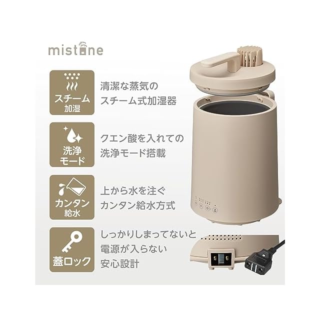 商品名:【清潔な蒸気のスチーム加湿器】ドウシシャ 加湿器 スチーム式 容量3L 木造10畳 プレハブ17畳 連続加湿時間5時間 加湿切替3段階 加湿量600ml/h 洗浄モード搭載 カンタン給水 mistone600S ベージュ