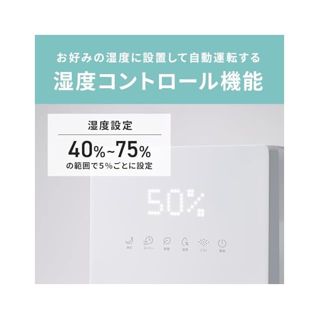 湿度コントロール機能付(40~75%範囲)と5%毎に設定が可能なのでお好みの潤いを保ってくれます。