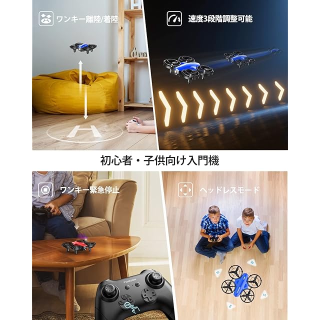 【子供・初心者向け入門機】Tomzon A24 ミニドローンは、手投げ離陸機能により簡単に離陸できるだけでなく、ワンキー離着陸機能やヘッドレスモード、高度維持機能などの使いやすい機能が装備されています。さらに、対戦バトル機能もあり、兄弟や親子で楽しめるおもちゃとしても最適です。初めてのドローンにぴったりな入門機です。旅行用玩具、誕生日プレゼントに最適です。