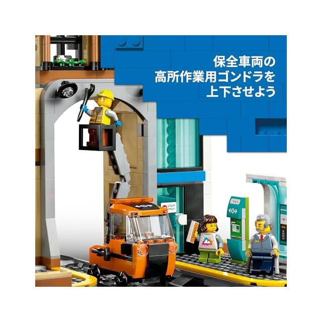セット内容 – 駅と高所作業車付き保全車両の組み立てに必要なパーツ、ミニフィギュア6体、赤ちゃんフィギュア1体、ハトのどうぶつフィギュア2体