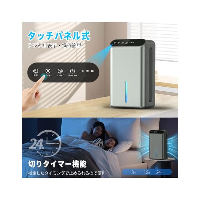 【LED液晶画面・7色環境光・アロマテラピー機能付き】弊社の除湿機はLED液晶画面を搭載しており、指で約0.1秒タッチするだけで操作でき、普通のプッシュボタンまたは機械式除湿機より操作が便利です。また、7色の雰囲気LEDライトが搭載されており、室内照明や夜間照明としてもご利用いただけます。 作動させるとLEDが光るタイプはベッドサイドランプとしても使えるので、寝室で使いたい方にぴったりです。 除湿機の側面にはアロマコットンが装備されており、アロマコットンにお好みのエッセンシャルオイルを垂らすと、除湿しながらお好みの香りを放出できます。