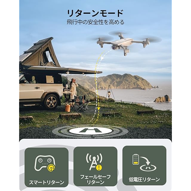 【リターンモード】3種のリターンモードがあり、安全で安心な飛行体験を提供します。ワンキーリターン:リターンボタンを押すだけで、ドローンは自動的に記録されたホームポイントに戻ります;低電圧リターン:低電圧時には自動的にリターンモードに入り、ドローンも自動的にホームポイントに戻ります;フェールセーフリターン:ドローンと送信機の接続が6秒以上途切れた場合、ドローンも自動的にリターンします。ドローンの紛失の可能性を大幅に減らすことができます。