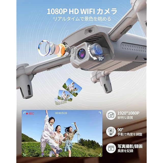 【1080Pカメラ】1080Pの高解像度カメラを搭載し、鮮明でクリアな映像を提供します。120°広角と90°調節可能なカメラ角度で、飛行時の撮影体験を最適化します!さらに、最大32GのTFカードに対応しており、美しい景色を保存することができます。