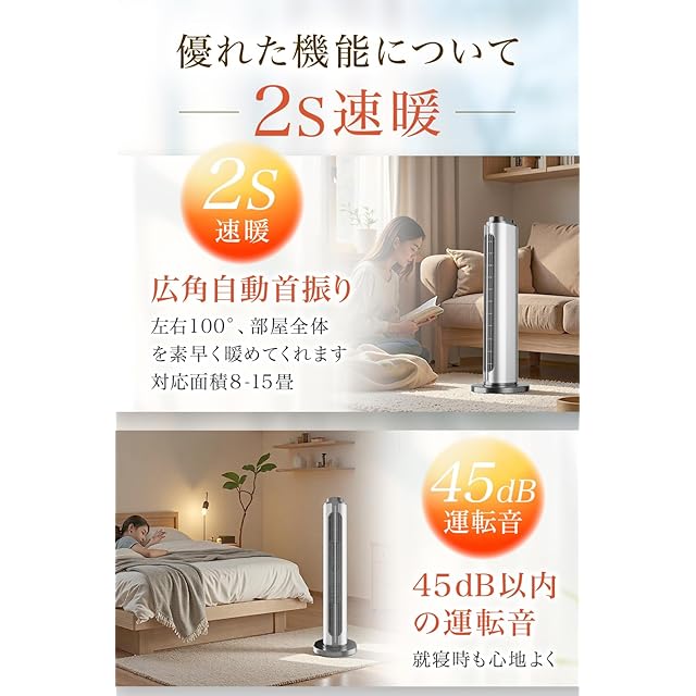 【45dB低騒音&多種保護機能】従来の電気ヒーターより暖かい優しい風が吹いてき、睡眠や仕事を妨げない静かでムラなく温風を出力します。転倒自動OFF:転倒時保護機能により、ヒーターを30°傾けると自動的に電源が切ります。オーバーヒート:ヒーター内を精密なセンサーが監視、温度が上がり過ぎた場合自動停止します。お子供とペットがいる家庭はご安心にお使いいただけます。