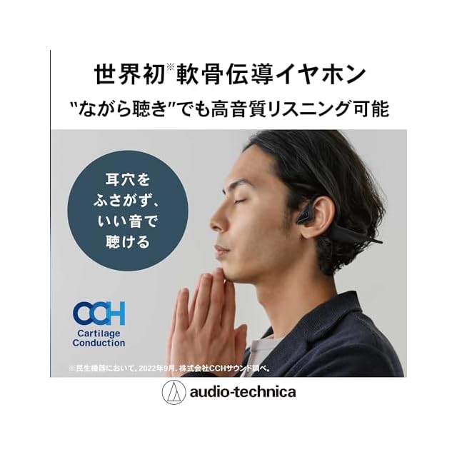 【第3の聴覚経路「軟骨伝導」を活用した、世界初※ のヘッドホン】「軟骨伝導経路」を活用した独自の振動構造を採用。耳穴を塞ぐことなく、音を効率的に鼓膜に伝えることができるため、“ながら聴き”でも高音質を実現します。また、耳穴に入れないため、耳が蒸れることなく衛生面でも安心してお使いいただけます。※民生機器において。2022年9月、株式会社CCHサウンド調べ。・本製品は、株式会社CCHサウンドから許諾された特許を使用しています。また、難聴の方の聞こえの改善を目的とした製品(補聴器)ではありません。