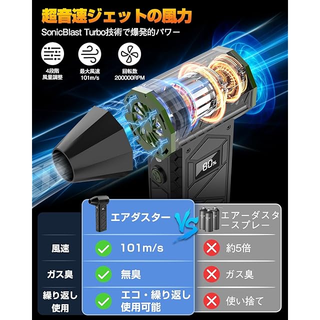 【マッハ級の風速を実現!そのパワー、まるで超音速ジェット】✅✅■圧倒的な風力の秘密はここに!✅✅①SonicBlast Turbo技術-自社開発のSonicBlast Turbo技術により、航空ターボダイナミクスを応用し、空気の圧縮と放出効率を最大化。ジェットエンジン並みのパワーと安定性を実現!✅✅②超高効率ブラシレスモーター-200000RPM回転の高効率ブラシレスモーターが最大風速101m/sを生み出し、業務用レベルの驚異的な風速を実現!✅✅③ダブルタービンファン構造-双重タービンファンが大量の空気を吸い込み、一瞬で放出。✅✅④専用タービンダクト-特別設計されたタービンダクトが圧力を最大化し、風を一点に集中!