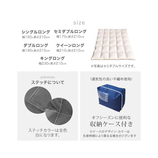 ※羽毛の産地は東アジア(台湾・中国等)です。 ※羽毛は天然素材のため、無臭ではございません。開梱直後や温度・湿度等の環境等により臭いを感じる場合がございますので、開封直後には風通しの良い場所での十分な陰干し等をお勧めいたします。なお、天然羽毛の臭いのため人体に害はございませんのでご安心ください。 ※2024年8月23日より、ライトアクア、ペールライラック、2025年9月1日よりチャコールグレーの販売を開始しました。 ※2024年8月29日より「コインランドリーで洗える」表記を追加しました。商品の仕様自体は変更しておりませんので以前ご購入いただきましたお客様につきましても、コインランドリーにてお洗濯いただく事ができます。 ※2025年9月3日より側地が防ダニ生地に変更となりました。
