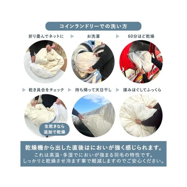 【コインランドリーで洗濯OK】(洗濯ネット使用) ※製品に付属している品質表示には「洗濯不可」と表記されていますが、こちらはご家庭での取り扱いの場合になります。 ※コインランドリーでのお洗濯・タンブル乾燥が可能です。洗濯・乾燥の際は必ずネットを使用し、単独洗いを行ってください。 ※洗濯後、乾燥が十分でないとにおいが発生する場合があります。生乾きの場合追加で乾燥をかけてください。 ※洗濯機の容量が足りないと生地を痛める場合があります。洗濯機のサイズは少しゆとりのあるものをお選びください。 ※乾燥機から出した直後は、羽毛のにおいが強く感じられます。これは高温・多湿で油分が溶け出しにおいが強まる羽毛の素材特性になります。しっかりと乾燥させ冷ます事で軽減しますのでご安心ください。 ※高頻度のお洗濯は、生地やダウンの劣化につながります。羽毛布団をより長くご使用いただくため、お洗濯は年に1回程度の頻度で行うようにしてください。