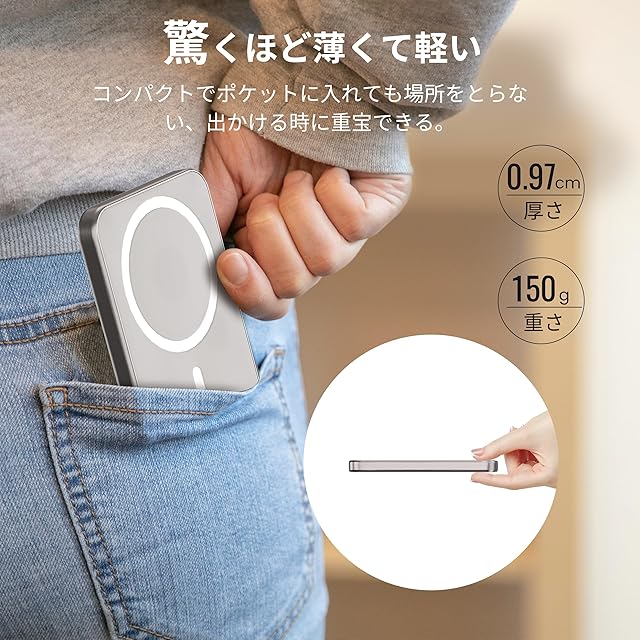 【コンパクト、驚くほど薄くて軽い】高級感があるアルミニウム合金素材と滑らかな感触あるシリコン作られており、デザインもシンプルで洗練されており、iPhoneとの相性も抜群!重量は150gと軽量で片手でも操作しやすいスリムサイズ、充電しながらスマホを操作しても疲れにくい。厚さ約9.7mmの薄型モデルはコンパクトでポケットに入れても場所をとらない、出かける時に重宝できます。