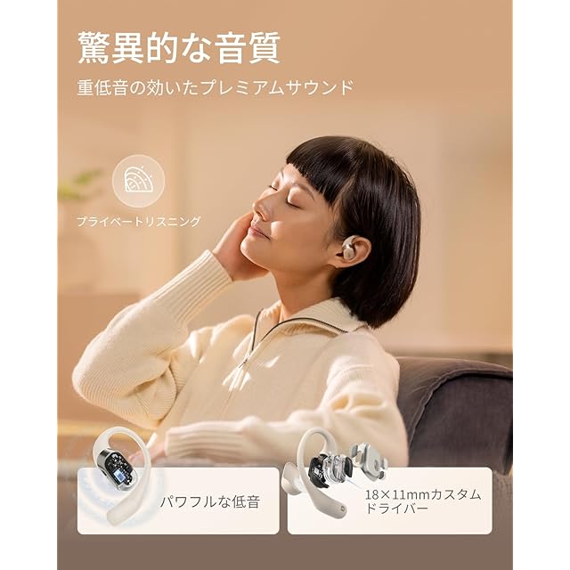 オープンイヤーの快適さ:耳の穴をふさがず、聞き疲れや蒸れを感じず、2層構造のリキッドシリコンを採用したイヤークッションコアと、わずか8.3gの軽量デザインにより、非常に快適な装着感をお楽しみいただけます。周囲の音を感じながらの使用も安心感があり、しっかりとしたフィット感をお楽しみいただけ、耳にも優しく衛生的です。