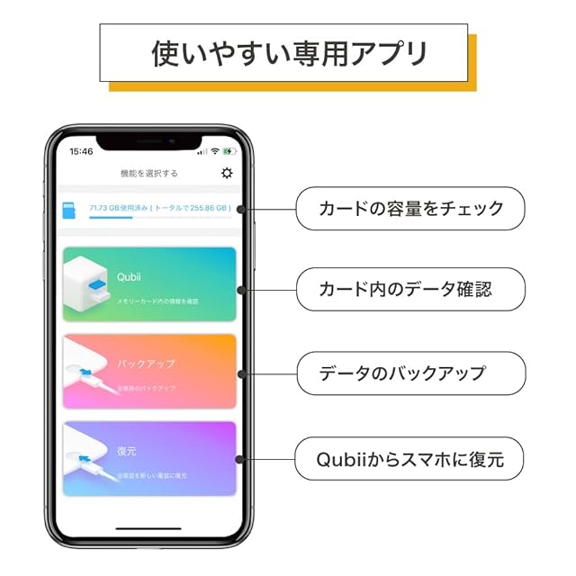 【無料&使いやすい専用アプリ】バックアップしたデータは専用アプリ「Qubii Pro」で閲覧・管理。異なるスマホで共用可能で、データが混ざることなくスッキリ管理。他のアプリを起動しながらでも使用可能です。※microSD 128GB付属