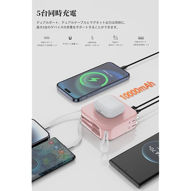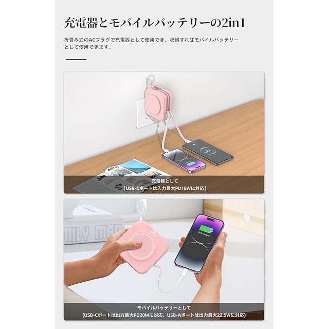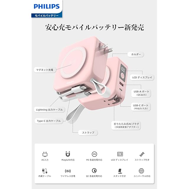 商品名:Philips(フィリップス) 10000mAh MagSafe マグネット式 モバイルバッテリー コンセント一体型 大容量 ACプラグ付 5台同時充電 MAX 22.5W出力 USB-A&入出力USB-C PD/パススルー機能/ディスプレイ搭載】Lightning/Type-Cケーブル内蔵 旅行用電源変換プラグ PSE認証済 ピンク DLP4347CP