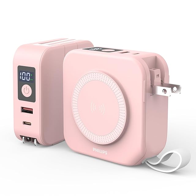 Philips(フィリップス) 10000mAh MagSafe マグネット式 モバイルバッテリー コンセント一体型 大容量 ACプラグ付 5台同時充電 MAX 22.5W出力 USB-A&入出力USB-C PD/パススルー機能/ディスプレイ搭載】Lightning/Type-Cケーブル内蔵 旅行用電源変換プラグ PSE認証済 ピンク DLP4347CP