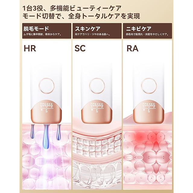 【1台3役機能&99万発の照射回数&三つのモード】HR(ムダ毛ケア用)、 SC(スキンケア用)、RA(美肌モード)脱毛器とスキンケア組み合わせる光美容器として、脱毛器の本体ではSR美肌機能を搭載して、家庭用脱毛器だけでなく、家で光美容器としてスキンケアします。99万発ショット数!ご家族と1台で共用できます!CT05家庭用脱毛器は99万の照射回数を出力でき、親子・友達・カップルで一緒にシェアできる家庭用光美容器です。(※使用回数、出力レベル、 毛質により個人差がある。)