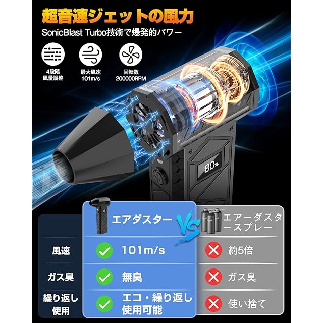 【マッハ級の風速を実現!そのパワー、まるで超音速ジェット】✅✅■圧倒的な風力の秘密はここに!✅✅①SonicBlast Turbo技術-自社開発のSonicBlast Turbo技術により、航空ターボダイナミクスを応用し、空気の圧縮と放出効率を最大化。ジェットエンジン並みのパワーと安定性を実現!✅✅②超高効率ブラシレスモーター-200000RPM回転の高効率ブラシレスモーターが最大風速101m/sを生み出し、業務用レベルの驚異的な風速を実現!✅✅③ダブルタービンファン構造-双重タービンファンが大量の空気を吸い込み、一瞬で放出。✅✅④専用タービンダクト-特別設計されたタービンダクトが圧力を最大化し、風を一点に集中!