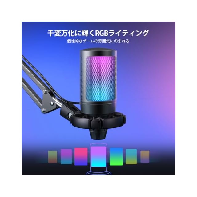 【独特なRGBライティング】FIFINE AmpliGameのRGBライティングは高級のゲーミング没入感と独特なパーソナリティを様々なコンビネーションで実現できます。マイク上部の高速反応タッチミュートボタンをタッチすると、マイクのミュート/ミュート解除の状態をすぐ切り替えます。マイクがミュートされたらRGBライティングはオフし、マイクの状態を直感的に感知できます。