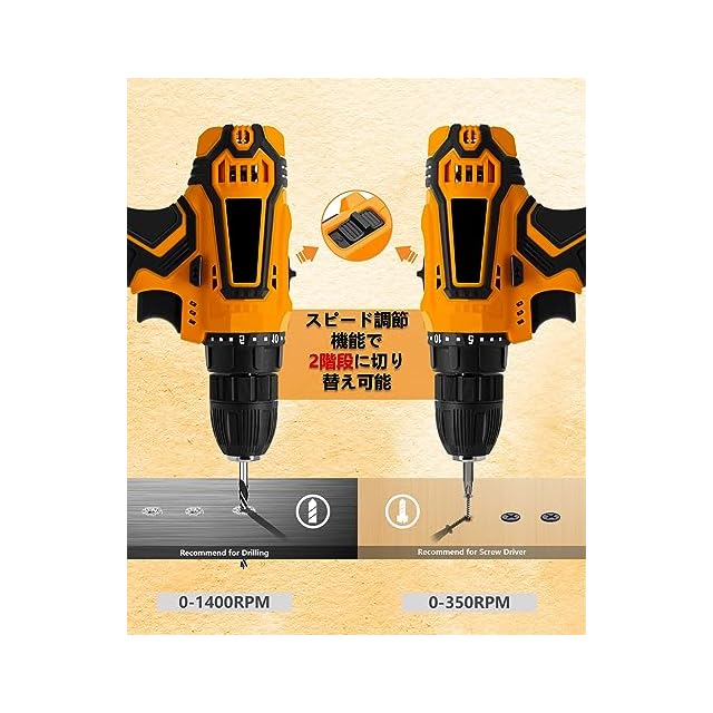 【 25段階トルク調整 & 高/低速の切り替】:クラッチ機能で25段階のトルク調節可能、作業ニーズに合わせて自由に調節できます。 電動ドリルの回転スピードは2段階(0~350RPM/0~1400RPM)が切り替え、トリガーを握る力の強弱で無段階微調整が可能です。スピード調節とトルク調節機能で幅広い材質に傷をつけず、きれいな組み立てができる。