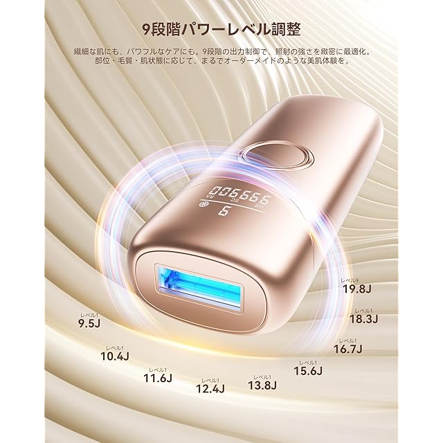 【SHRモード&9段階照射レベル&全身ケア】SHRモード搭載のyundoo脱毛器は、脱毛と同時に美肌ケアも叶える最新光美容器。毛質や肌色に合わせて調整できる**9段階照射レベル(9.5J~19.8J)**を搭載し、初心者からハイパワーを求める方まで、誰でも自分に合ったケアが可能です。メンズにもレディースにも適している。