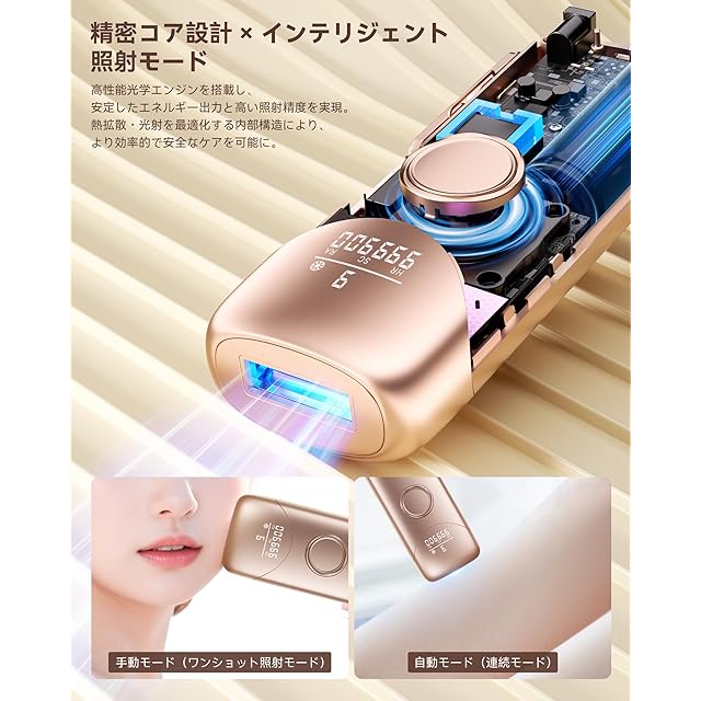 【無痛ケアのVIO対応&手動/自動モード】SHRモードは全身脱毛だけでなく、VIO脱毛に適している。肌に優しいスキンケア機能で、皮の負担を減らし、肌をより早く滑らかに回復させる。手動モードは1回を照射して、顔、唇、指などの小範囲の脱毛に適用する。自動モードは高速連発持続照射で、脇下、VIO、背中、腕、腹、などの広い範囲の脱毛に最適です。