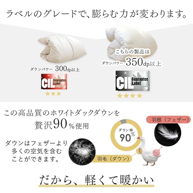 【スタッフのおすすめポイント!】<br> ・暖かさを逃がさない フィット性の高い30マスキルト<br> ・4つ星 CILシルバーラベル取得<br> ・ホワイト ダックダウン90%<br> ・丁寧に仕上げた日本製<br> ・かさ高145mm以上、ダウンパワー350dp以上<br> ・パワーアップ加工でふっかふか!<br> ・SEK認定のアレルGプラスで抗菌<br> ・除菌・防ダニ・防カビ クリーンオゾン加工<br> ・羽毛の抜け出しを防止するダウンプルーフ加工<br> ・羽毛の膨らみを邪魔しない超軽量生地<br> ・安心の7年<br>・ダニの侵入を防ぐ 高密度生地