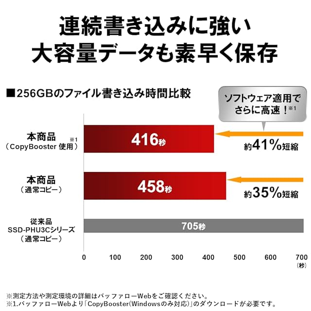 【連続書き込み時も安定】データアクセス方法の改善により、大容量データの連続書き込み時の速度低下を抑制。Windowsパソコンなら、アプリの使用でコピー時間をさらに高速化。