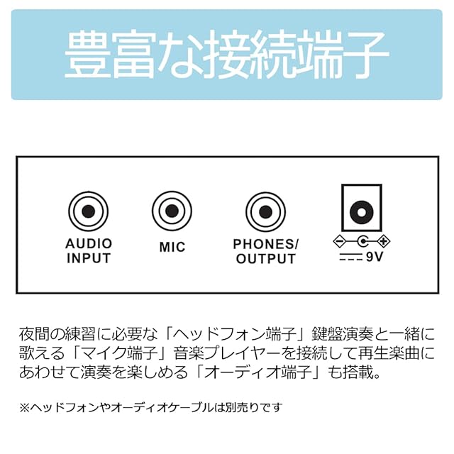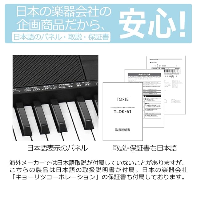安価なキーボードでは英語表記のものが多いですが、日本のブランド“トルテ”のキーボードは日本語のパネルを採用。お子様でも演奏をお楽しみいただけます。もちろん書も付属しておりますので、安心してお使いいただけます。