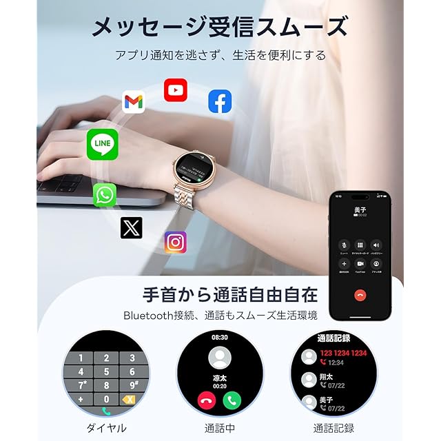 【Bluetooth通話機能付き&着信通知】この女性用 スマートウォッチは 最新の5.3Bluetooth技術を搭載し、スマートフォンと簡単にペアリング可能です。これにより、着信、メッセージ、SNS通知(LINE、Twitter、Instagramなど)の通知をリアルタイムで受け取ることができます。重要なメッセージを見逃すことなく、常に最新通知を手元で確認できるので、忙しい日常でも安心です。エレガントなデザインと高度なテクノロジーが融合したこのスマートウォッチで、日常生活をより便利でスタイリッシュに演出しませんか?