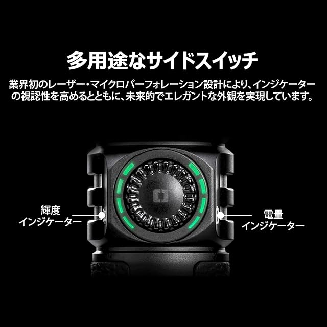 [操作性抜群のユーザーフレンドリー設計] 大型の金属製サイドスイッチを採用し、操作性を大幅に向上。滑らかな無段階調光が可能で、快適な使用感を実現しました。スイッチには明るさとバッテリー残量が表示され、キャンプや登山などのアウトドア活動でも使いやすさを追求しています