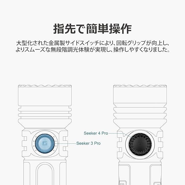 Seeker 4 Pro は、クラシックな懐中電灯Seeker 3 Proのアップグレード版で、小型、高輝度、充電式フラッシュライトです。4つのランプビーズと高級TRIレンズを搭載し、驚異的な4,600ルーメンの出力と260メートルの照射距離を実現できます。 ハンディライトSeeker 4 Proは、人間工学に基づいて設計された手持ち位置は、優れたグリップ力と滑り止め効果を備えています。大型化された金属製サイドスイッチにより、回転グリップが向上し、よりスムーズな無段階調光体験が実現し、操作がやすくになります。 さらに、Seeker 4 Proには、懐中電灯の自動ロック/ロック解除、充電、保管、持ち運びのオプションを提供する業界をリードする革新的なホルスターが付属しています。懐中電灯をホルスターに入れると、ユーザーの安全を確保するために明るさを600ルーメン未満にインテリジェントに下げます。 デュアル充電オプション (Type-C 充電と専用充電の両方) 、2つの異なる色温度(クールホワイト:5700K ~ 7000K /ニュートラルホワイト:4000K ~ 5000K) を備えており、お好みの照明体験を得ることができます。 緊急用、キャンプ、ハイキング、アウトドア及びその他のシナリオに適しており、Seeker 4 Pro は、優れたユーザー体験をもたらします。