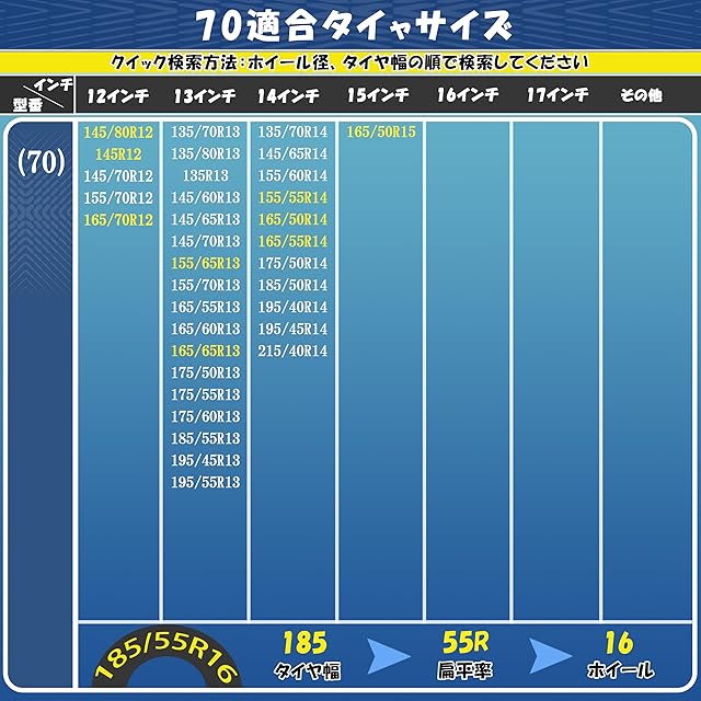 簡単装着で取扱・販売しているタイヤチェーンは全てチェーン規制対応ですが、チェーン規制対策用として特におすすめタイヤチェーンは、車の移動なしで簡単に装着、 金属製よりも振動が少ないため乗り心地がよく、積雪路でも凍結路でも安定できる非金属製のタイヤチェーンとなります。KE70適応タイヤ: 145/80R12 135/70R13 135/80R13 145/60R13 145/65R13 145/70R13 155/65R13 155/70R13 165/55R13 165/60R13 165/65R13 175/50R13 175/55R13 175/60R13 185/55R13 195/45R13 195/55R13 135/70R14 145/65R14 165/50R14 165/55R14 175/50R14 185/50R14 195/40R14 195/45R14 215/40R14 165/50R15 145R12 145/70R12 155/70R12 155/60R14 155/55R14 135R13 165/70R12