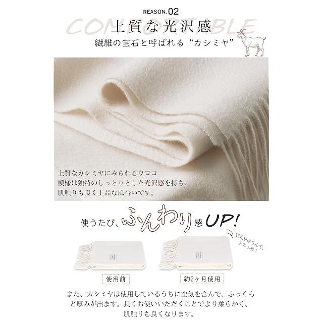 【上質な光沢・優しい肌触り】カシミヤは、ウール原料の中でも最高級とされる素材です。繊維が細く柔軟なため、非常に柔らかな肌触りと上品な光沢を持っています。また、カシミヤマフラーは使用するうちに空気を含み、ふっくらと厚みを増します。長い間ご使用いただくことで、ますます柔らかさが増し、肌触りも向上します。このスカーフは肌に優しく、贅沢な柔らかさを備えており、耐久性も優れているため、何年もご愛用いただけます。本物のカシミヤの肌触りと暖かみを感じてください。