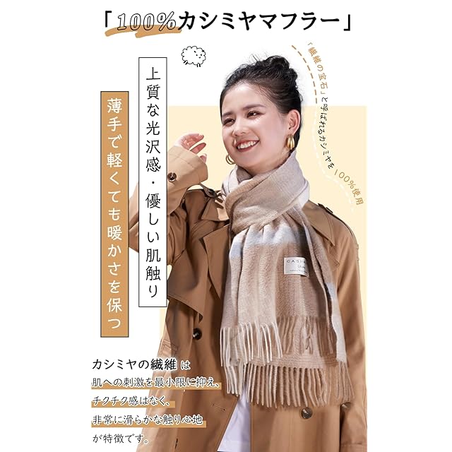 【保温性・軽くて暖かい】カシミヤマフラーは防寒具として重宝され、着こなしのアクセントとしても活躍します。カシミヤの繊維は非常に細くて、軽量なのに保温性が抜群で、クリンプと言われる縮れ毛が熱伝導率の低い「空気」をたくさん抱え込みます。そのためカシミヤマフラーは冷たい空気を遮断し、熱が逃げるのを防ぐのでとても暖かく着用できるのです。100%カシミヤマフラーのしっとりとした質感と暖かさはやみつきになること間違いなし!