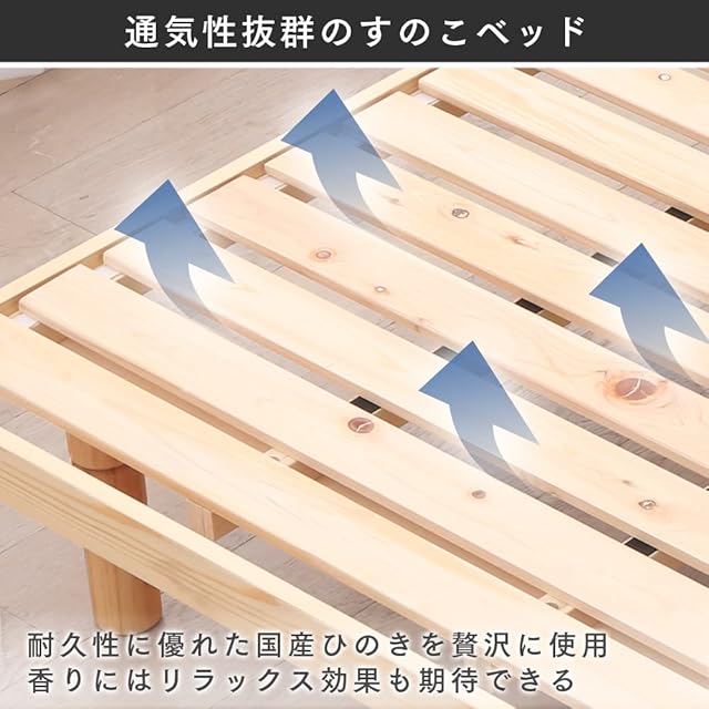 【天然木の優しい風合い】すのこには国産ひのきを使用。ひのきは耐久性に優れ、香りにはリラックス効果も。<br>【簡単な高さ調節】脚はネジ付きで簡単に高さ調整が可能。丁寧に面取りされたフレームは、シーツや衣服も引っ掛かりにくい。