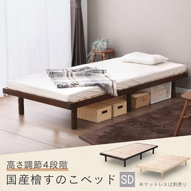 アイリスプラザ ベッド ベッドフレーム セミダブル 4段階 高さ調整 耐荷重約250kg 国産ヒノキ 檜 すのこベッド ナチュラル 幅約120×奥行約196×高さ約6~29cm
