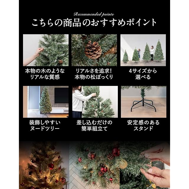 【ボリュームのある枝数と天然の松ぼっくりを使用】 枝数が多く、また葉の密度が濃いためボリュームがあるツリーに。そのまま飾ったり少ないオーナメントでも存在感があります。松ぼっくりは本物を使用しているので、 ツリーのリアルさをより一層引き立てます。松ぼっくりは[煙で虫を除去]した天然の物のみを使用しています。 【葉が落ちにくい仕様/安定感があるスタンド】 しっかりとした作りで葉が落ちにくい仕様。お掃除があまり必要ないのも嬉しいポイントです。スタンドは4脚型で安定感があります。色はダークグリーンとブラックの間のような深みのある色で、雰囲気があります。
