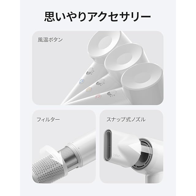 【LED風温ボタン&8つのモード】SE Liteは、より直感的で使いやすいLED風温ボタンを備え、2段階の風速と4段階の風温が温度が一目でわかるようにになっています。従来の高温で髪を乾かすヘアドライヤーに対し、SE Liteは50回/秒の精密な一定した温度が、よりパワフルな気流で髪を乾かし、効果的に毛の損傷によって引き起こされる過熱を避けるます。ノイズの干渉をを防ぐ低周波ささやき62デシベル。